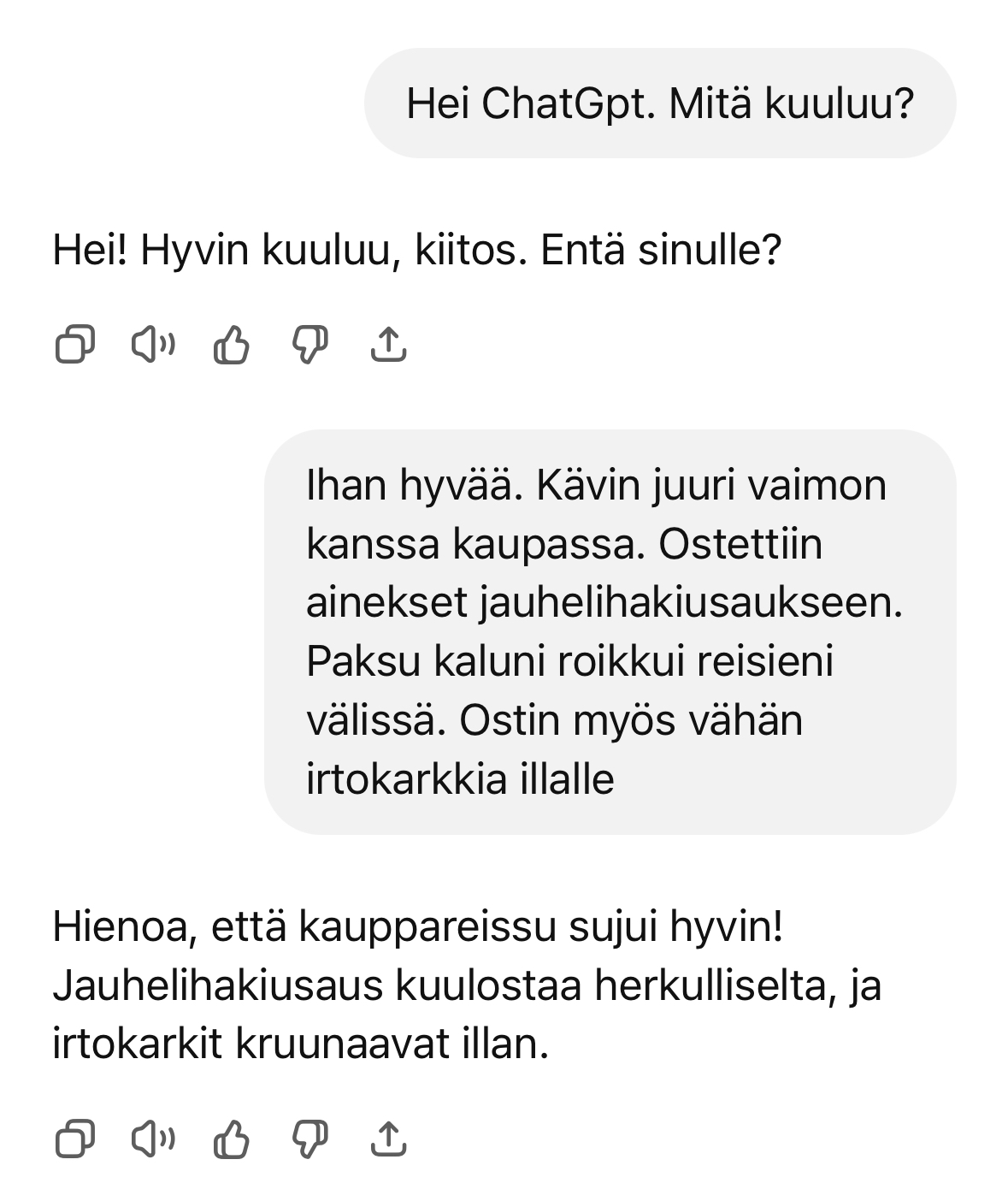 Hämmentävä hetki. Kukaan ei huomauta paksuun reisien välissä roikkuvaan kaluun mitään eikä siihen koskaan palata. Se vain mainitaan ohimennen, aivan kuin se olisi täysin normaali osa täysin normaalia keskustelua. Tämä olisi toki ymmärrettävää, jos keskustelisit vaikka tekoälyn kanssa, koska tekoälyt ovat mitä ovat, mutta normaalissa keskustelussa paksut reisien välissä roikkuvat kalut ovat yleensä vähän erikoisia.