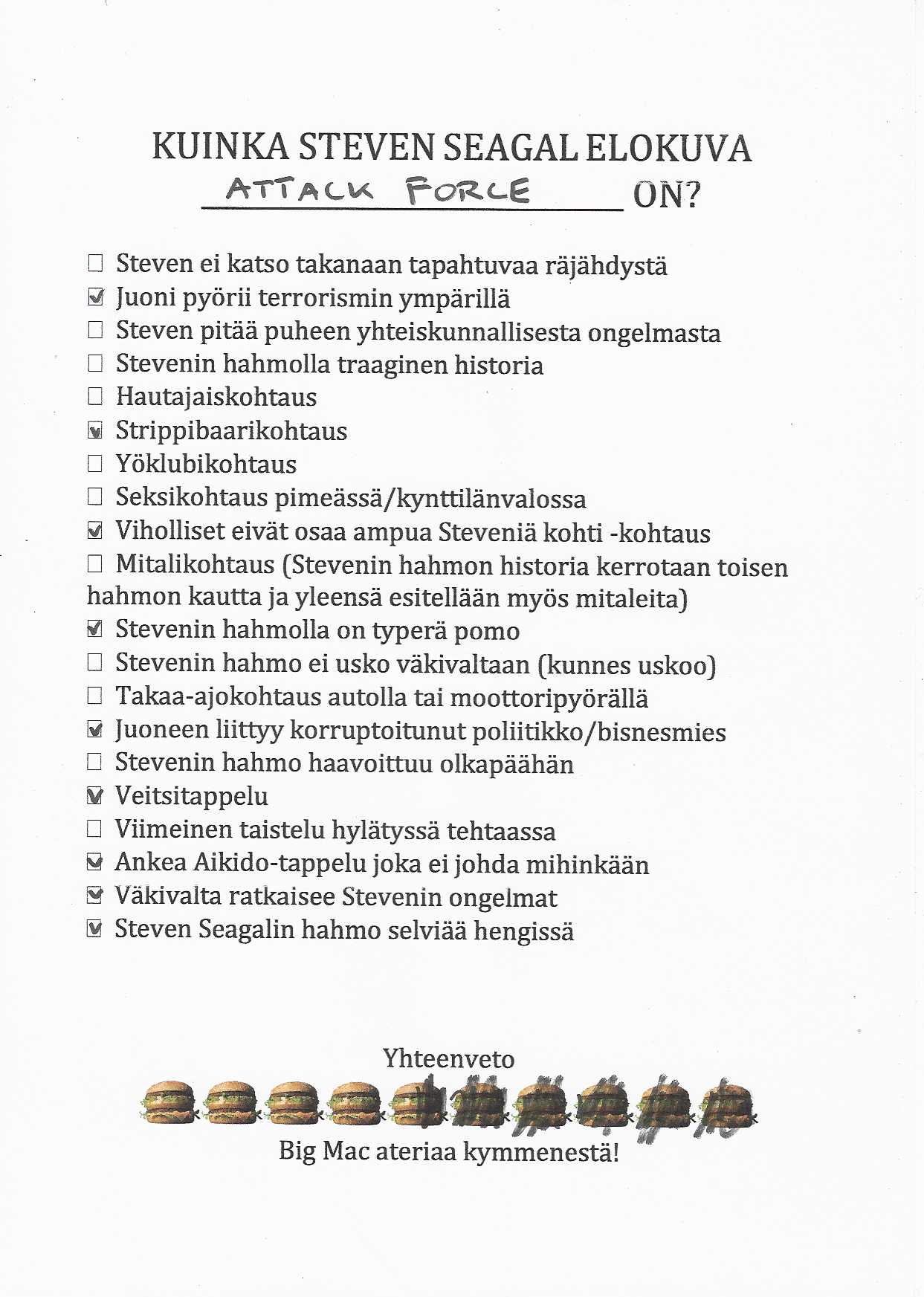 Vuonna 2006 valmistunut Steven Seagalin tähdittämä Attack Force on luonnonlakien vastainen elokuva, sillä se on niin vitun epäpätevä tarinankerronnassaan, etten edes huomannut Stevenin olevan lihava siinä. Vasta aivan elokuvan lopussa, kun hän taisteli vampyyrikuningatarta vastaan ja kaksoisleuat tulivat nahkatakin varjoista esiin minä vasta muistin että aivan, läskivitsithän se kantava juttu näissä puruissa piti olla.