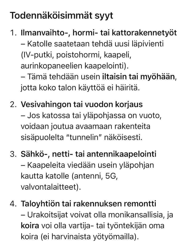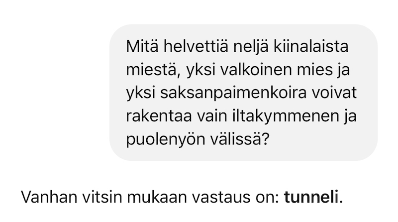 Seinänaapurit olivat suht ok, heidän harrastus oli vain porata ruuveja kiviseinään välissämme. Yläkerrassa sen sijaan oli jotain todella outoa meneillään. Asunnon yläpuolellamme piti olla talon kirjojen mukaan tyhjä, mutta siellä asui (ainakin) neljä kiinalaista miestä, yksi valkoinen mies ja valkoisen miehen saksanpaimenkoira. He olivat koko päivän täysin hiljaa, mutta aina kun kello lähestyi kymmentä illalla, he alkoivat rakentaa jotain. Porailu kesti yleensä puoleenyöhön asti. Mitä helvettiä neljä kiinalaista miestä, yksi valkoinen mies ja yksi saksanpaimenkoira voivat rakentaa vain iltakymmenen ja puolenyön välissä? Taidan kysyä ChatGPT:ltä.